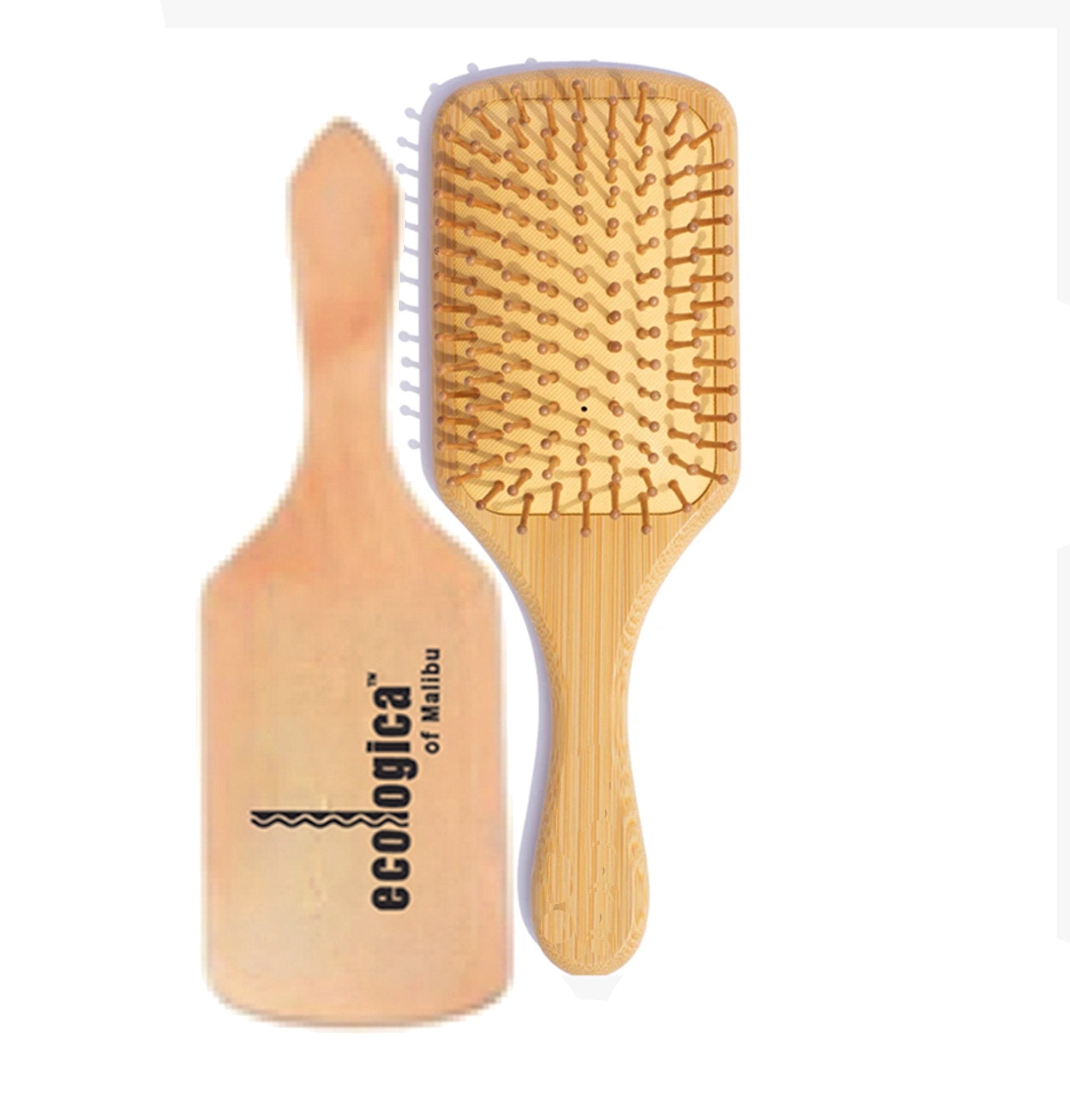 This natural, non-toxic, biodegradable wooden hairbrush is designed to gently massage the scalp while evenly distributing the hair’s natural oils or ecologica's PURERoot Hair & Scalp Revitalizer from root to tip. Crafted with smooth bamboo bristles set in natural rubber, it delivers a gentle yet durable brushing experience that effortlessly detangles knots, reduces breakage, and smooths the hair.